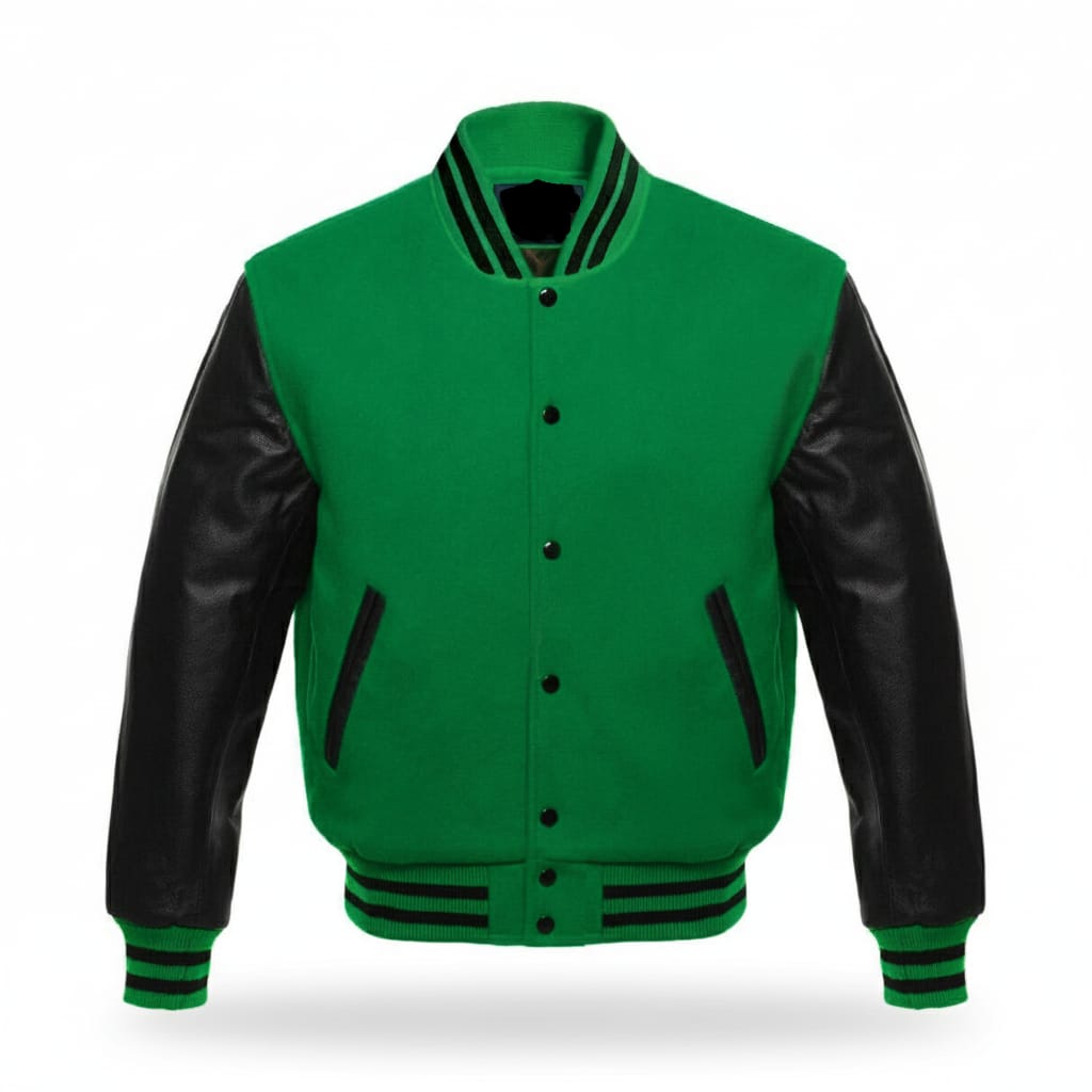 Be the first to review “Green varsity letterman baseball bomber jacket with wool body and black leather sleeves | High quality baseball bomber jacket | Handmade jacket | Green and black varsity jacket” Cancel reply